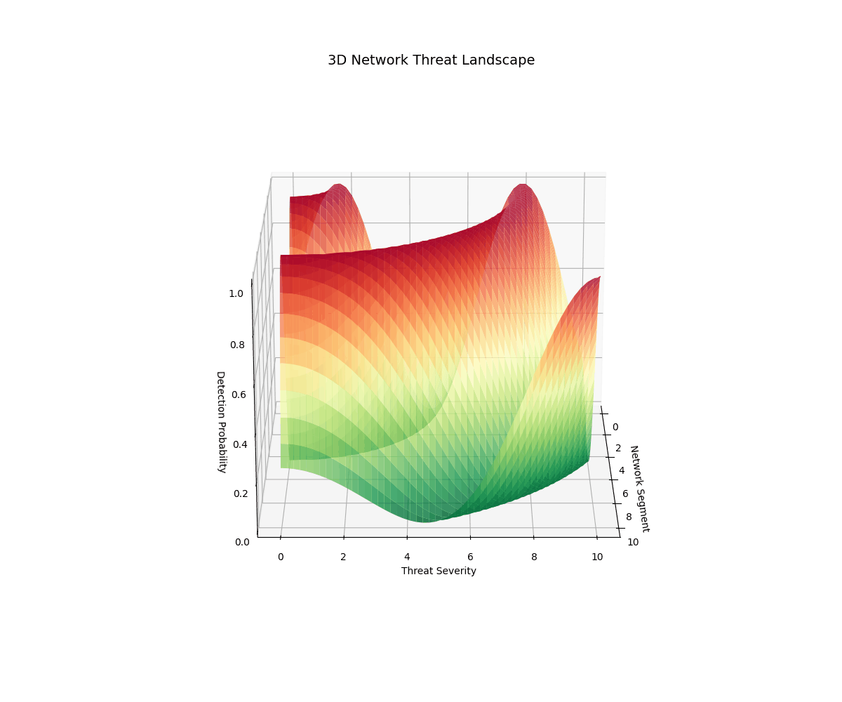 Real-time 3D/2D visualizations of threat landscapes, attack patterns, network security posture evolution, and incident response optimization.