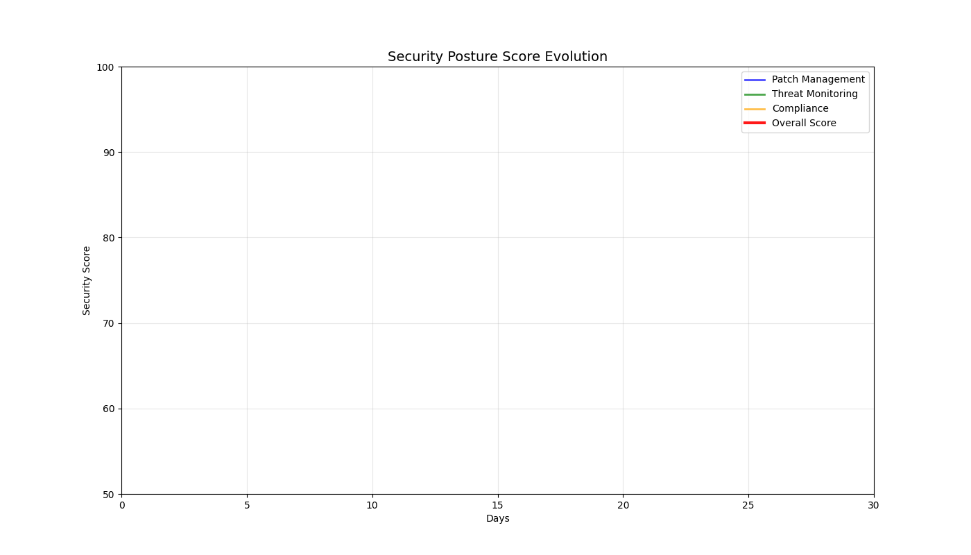12. 2D Security Posture Evolution - 30-day trends in patching, monitoring, compliance, and overall score