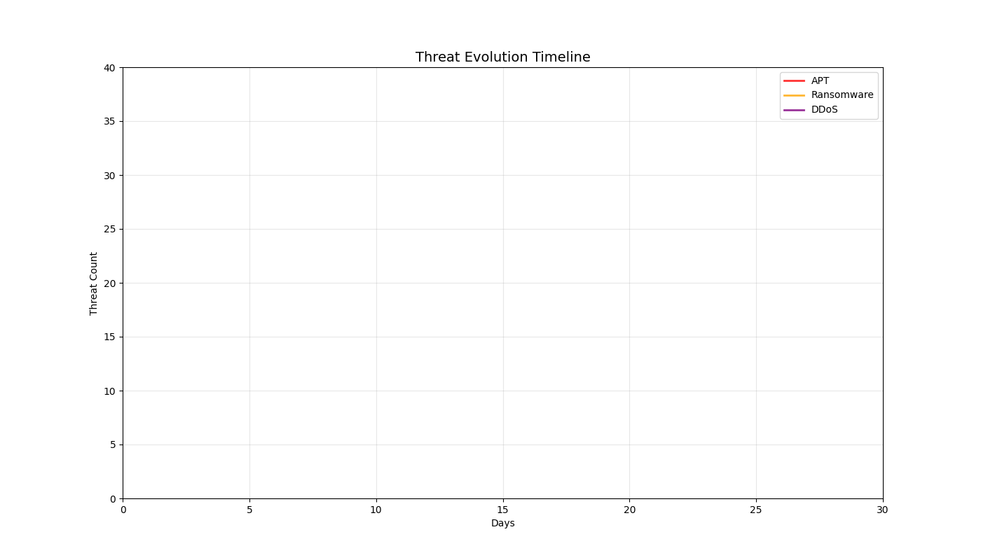 7. 2D Threat Evolution Timeline - 30-day attack pattern trends across APT, ransomware, and DDoS