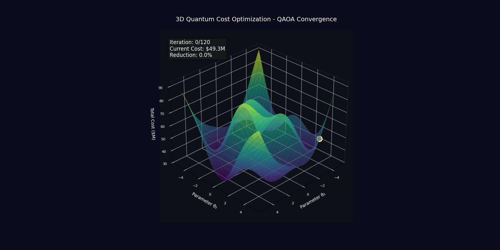 Advanced 3D visualizations demonstrating precise quantum optimization calculations for inventory allocation and cost surface convergence.