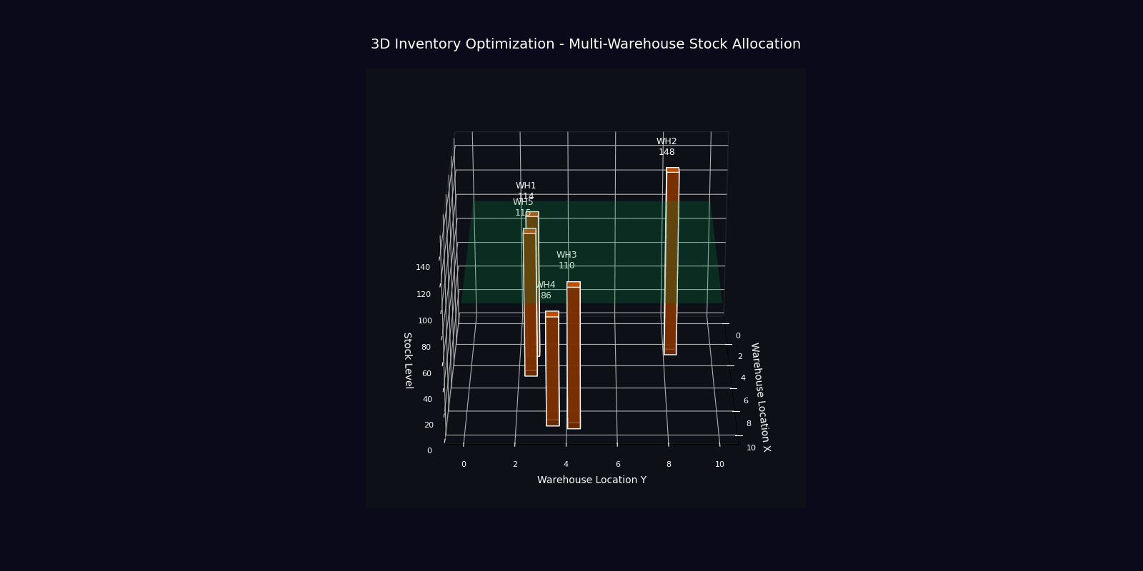 3D simulation: multi-warehouse stock allocation converging to optimal levels using QAOA