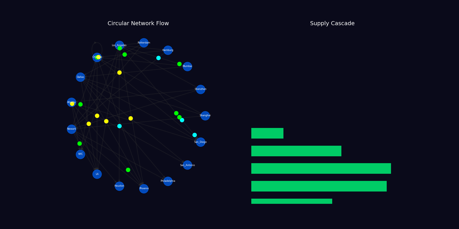 4-second simulation: circular network with animated particles, supply cascade visualization