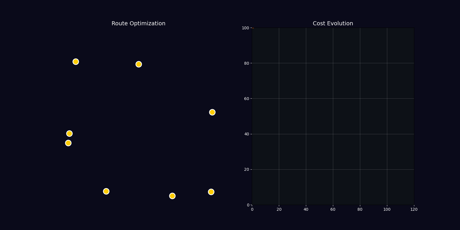 4-second simulation: geographic route optimization with real-time cost evolution tracking