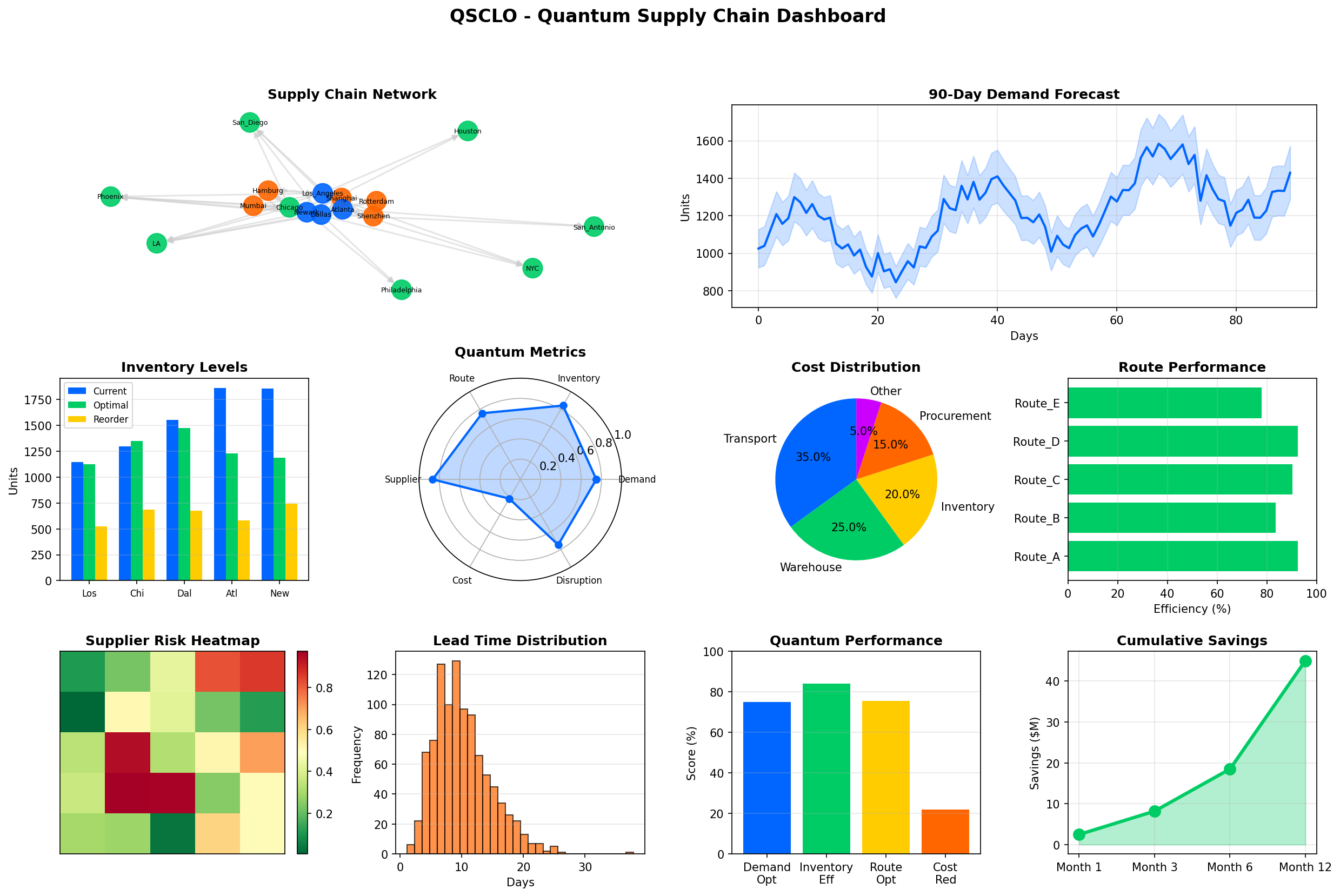 The Quantum Supply Chain Logistics Optimizer (QSCLO) uses 28-qubit quantum computing to enable Fortune 500 companies to optimize procurement, inventory, routing, and demand prediction in real-time. By leveraging QAOA and quantum annealing, QSCLO reduces costs by 15-25% and eliminates broker dependency.