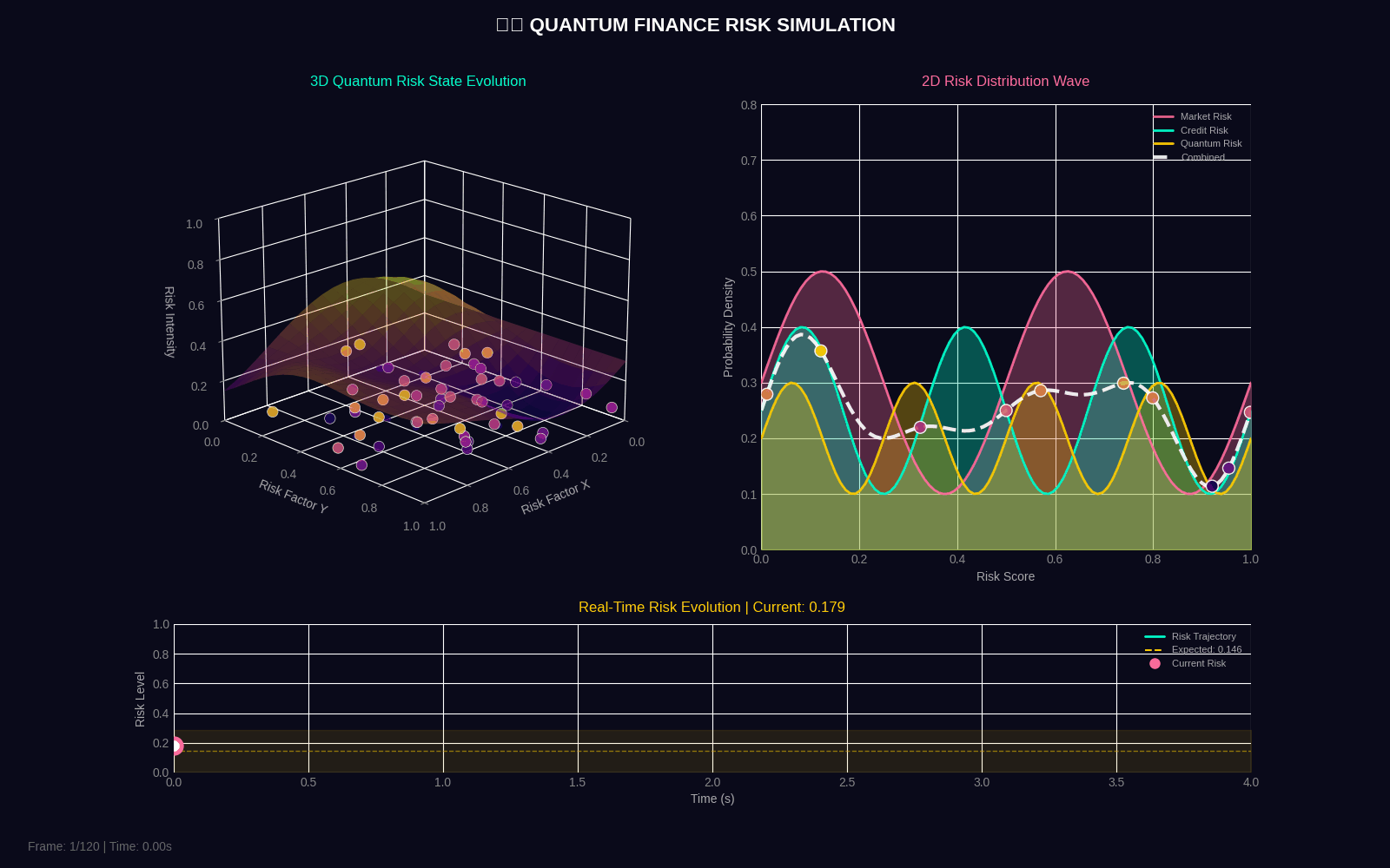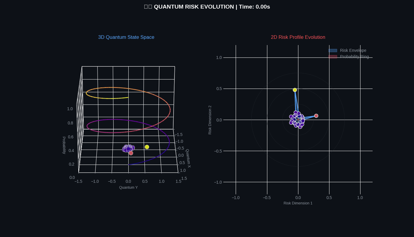 QFRM generates two 4-second GIF simulations showing quantum risk evolution in both 3D and 2D.